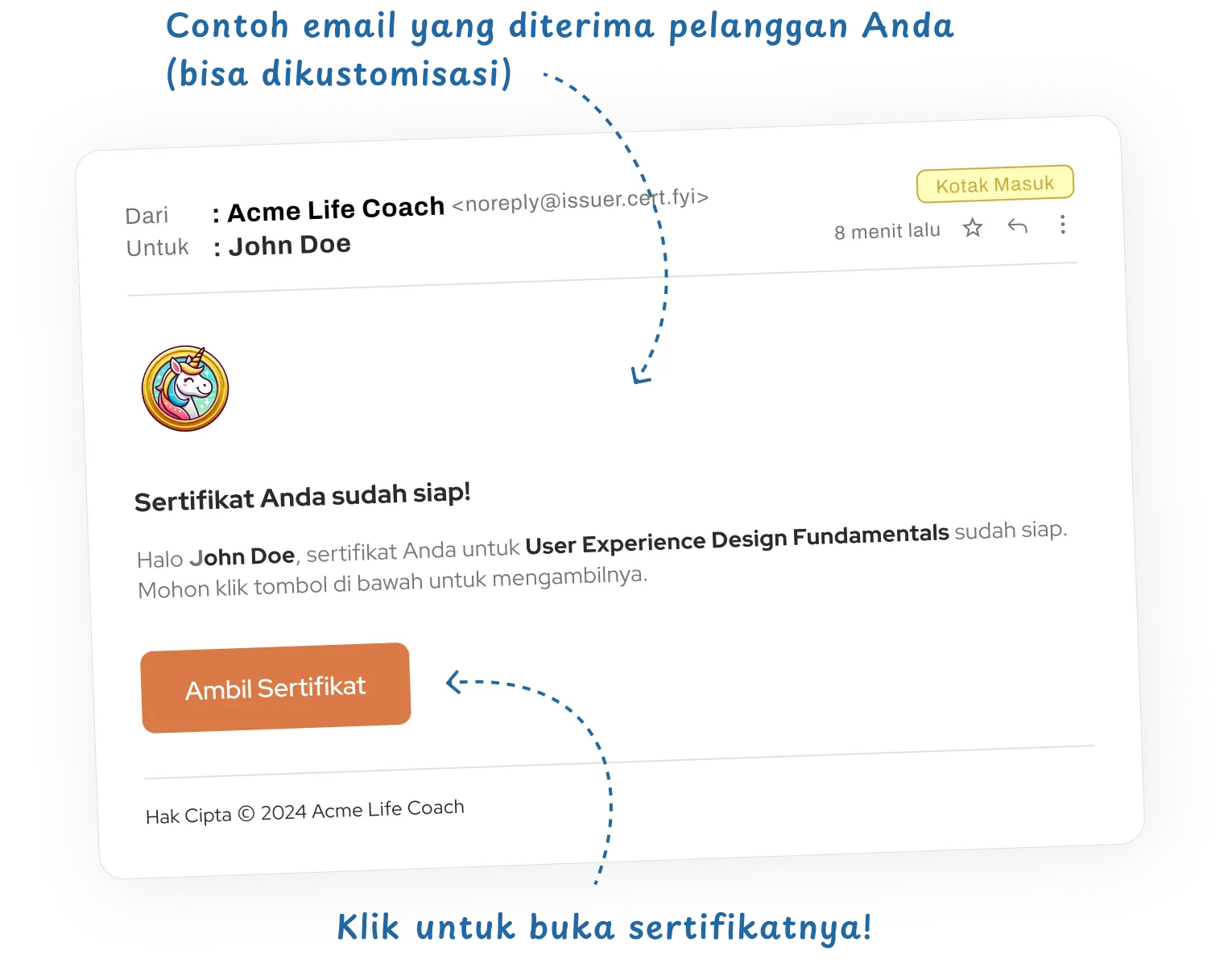 Tambahkan logo, ubah font, dan sesuaikan warnanya dengan identitas merek Anda. Sertifikat, halaman webnya, dan email yang Anda kirim semuanya dapat disesuaikan.
